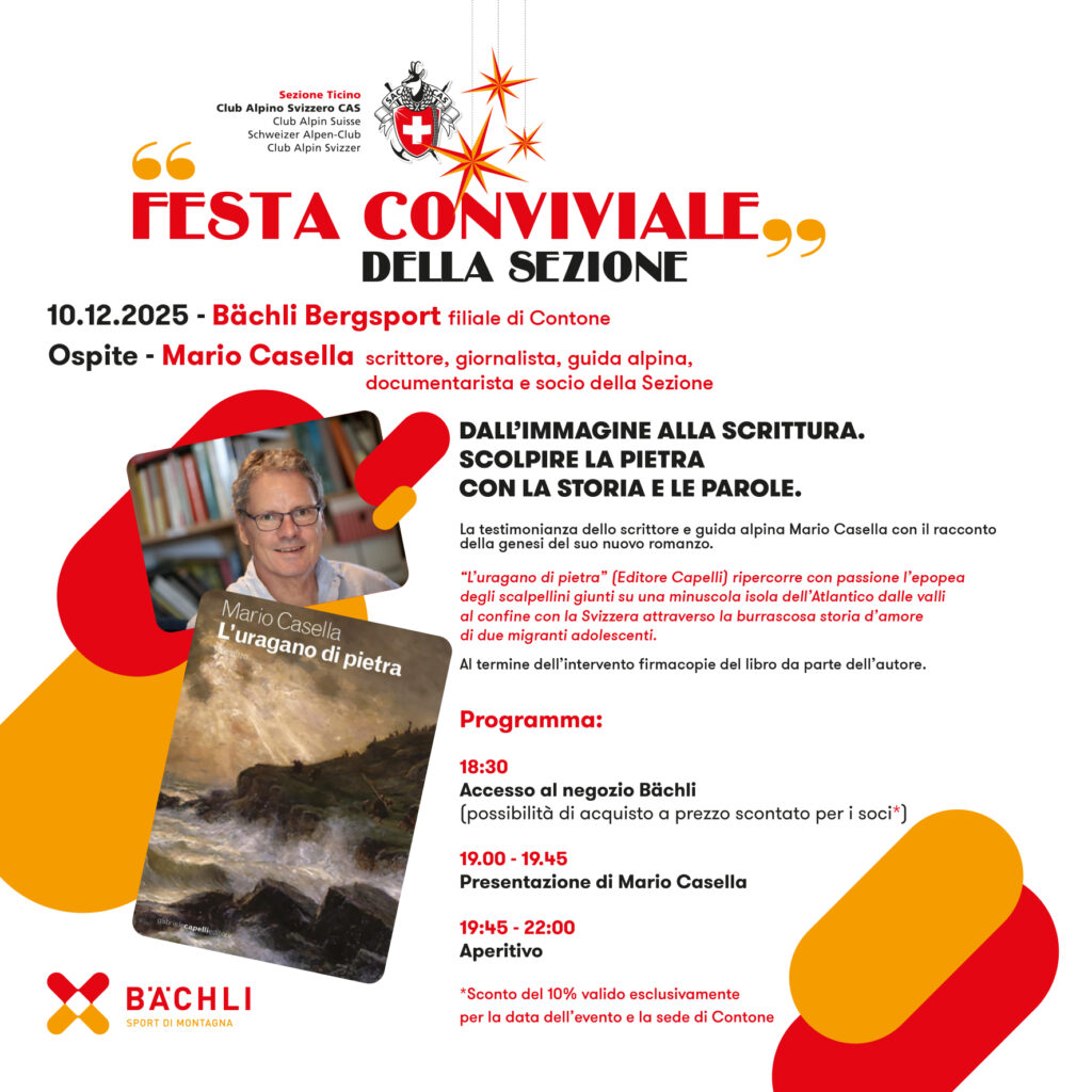 Mercoledì 10.12.2025 – Festa conviviale della Sezione Vi aspettiamo numerosi, mercoledì 10.12.2025, dalle 18:30 da Bächli Sport a Contone.Ospite – Mario Casella, scrittore, giornalista, guida alpina, documentarista e socio della Sezione.Di seguito il programma completo: FESTA CAS 2025